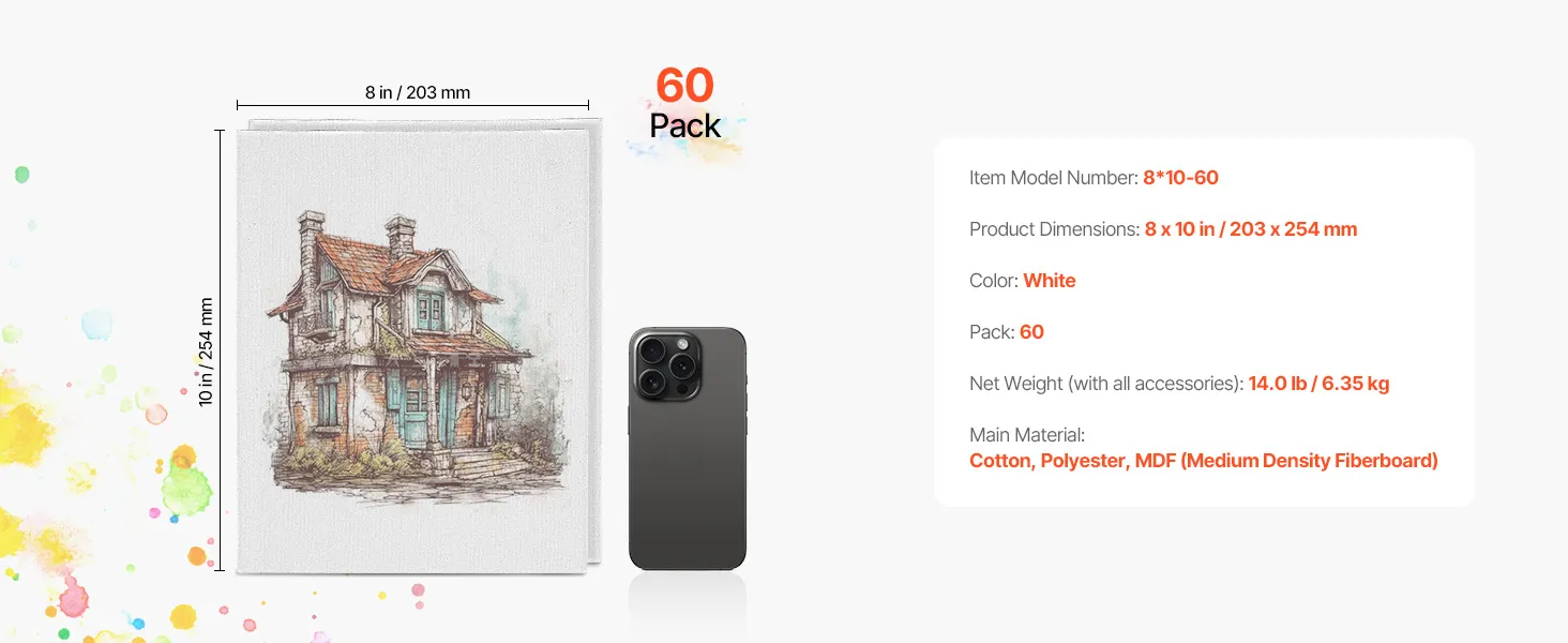 Value Pack: The 60-pack 8 x 10 inch painting canvas set caters to various your needs. Whether you're an individual artist working on multiple pieces or a group involved in collaborative art activities, this set is ideal for you.