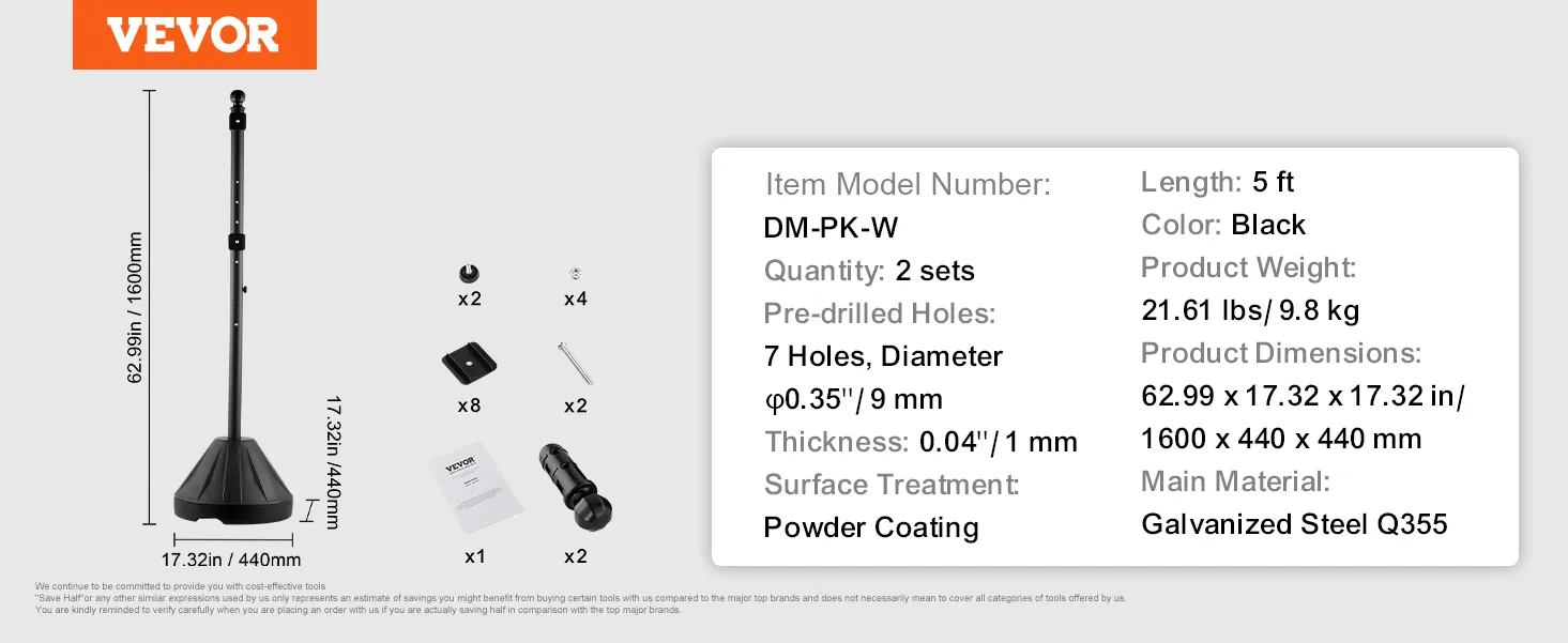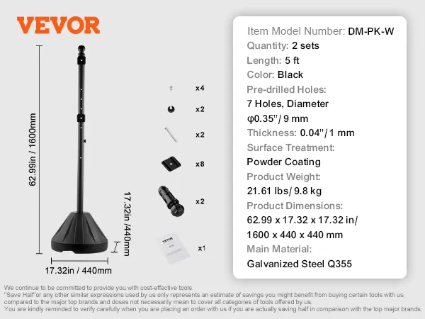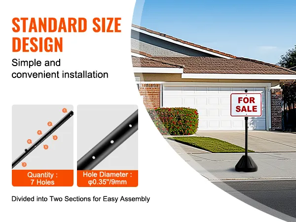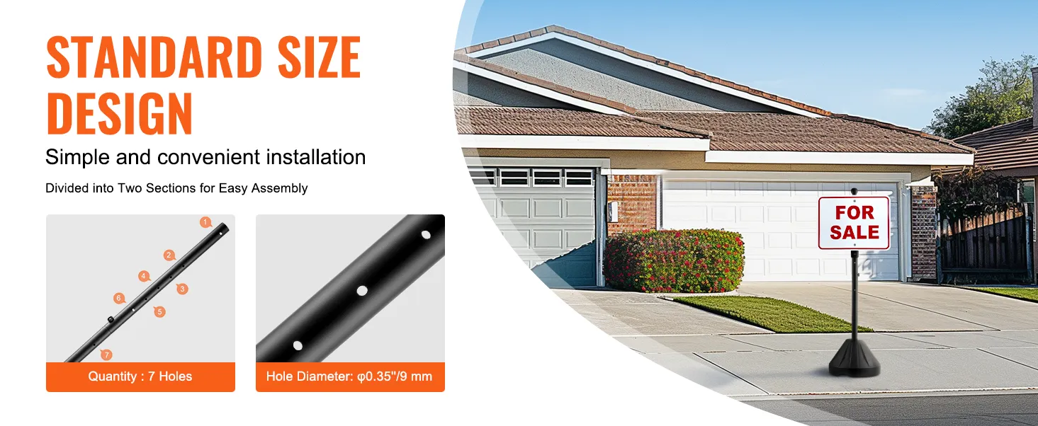 Robuust en duurzaam: de metalen bordpaal bestaat uit 2 palen, elk gemaakt van hoogwaardig gegalvaniseerd gietstaal Q235, waardoor een hoge sterkte en een lange levensduur worden gegarandeerd. Ze hebben een corrosiebestendige coating om roesten te voorkomen, zodat ze zelfs bij regen, sneeuw of hete zomers kunnen worden gebruikt.