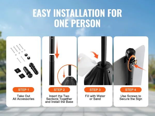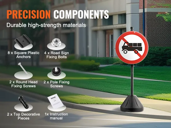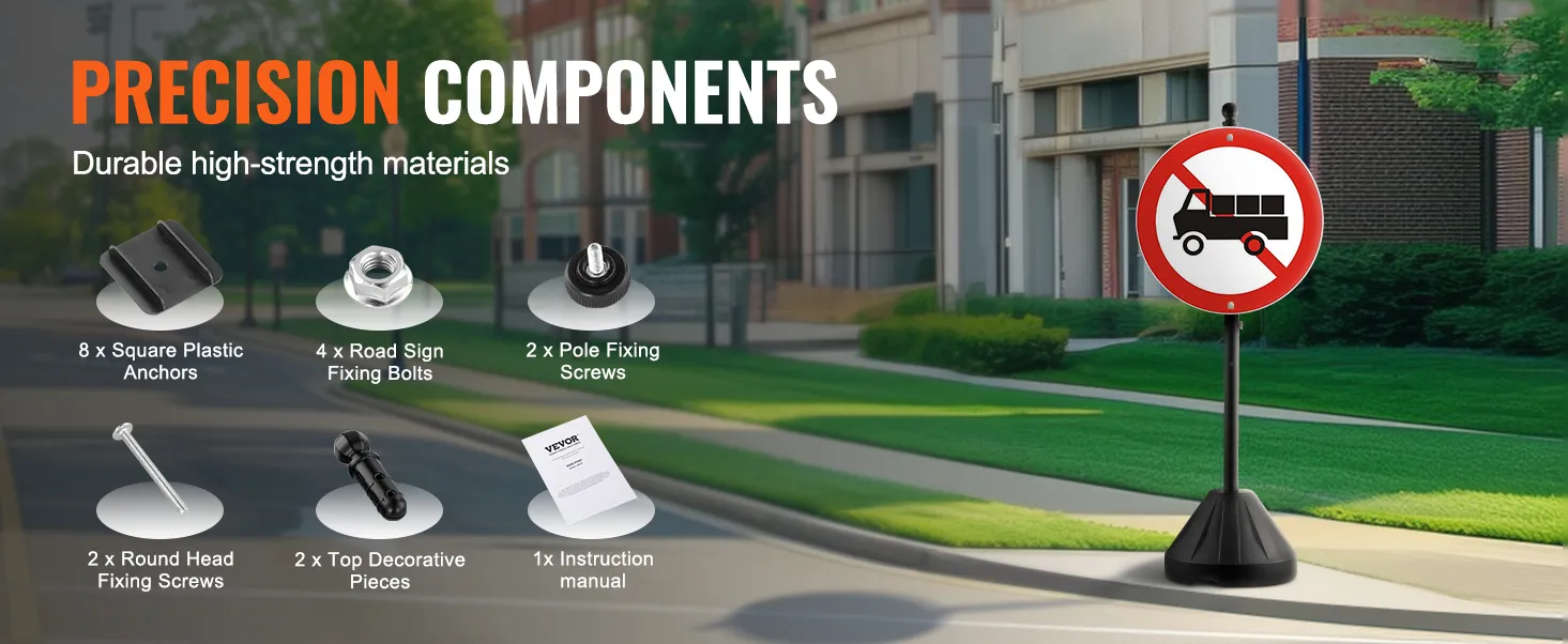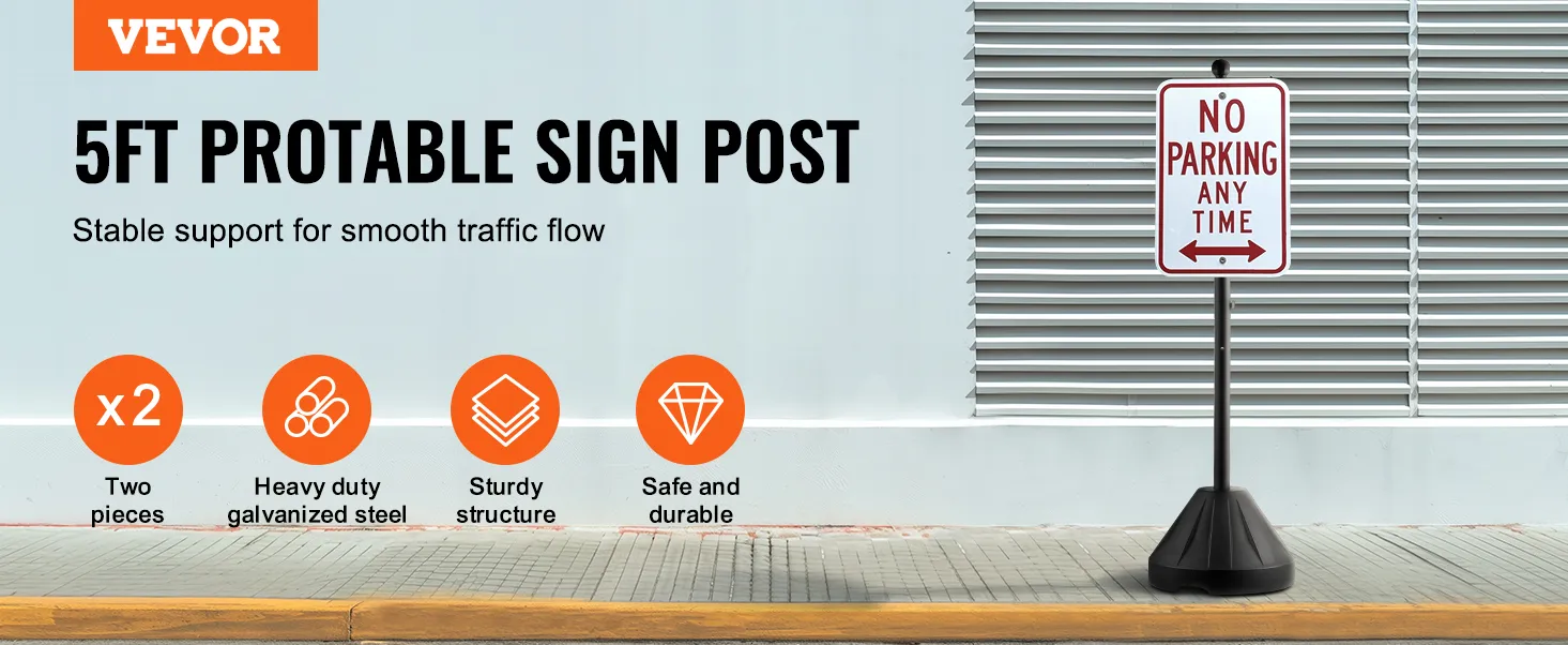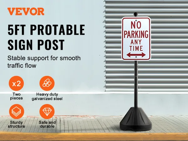 De VEVOR gietijzeren bordpaal heeft een gebruiksvriendelijk ontwerp. Hij wordt geleverd met wielen, zodat u hem gemakkelijk naar elke locatie kunt verplaatsen. Dit maakt hem perfect voor tijdelijke bewegwijzering. De basis kan worden verzwaard met water of zand, zodat hij stabiel blijft in verschillende weersomstandigheden. U hoeft zich geen zorgen te maken dat het bord omvalt. Het maakt niet uit of u een tijdelijke parkeerplaats moet opzetten of voetgangers moet begeleiden bij een evenement, onze bordpaal biedt de flexibiliteit en stabiliteit die u nodig hebt.