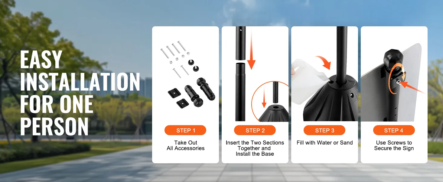 Eenvoudige installatie vereist geen speciaal gereedschap of moeizaam graafwerk. De paal wordt eenvoudig in de grond gestoken, de basis bestaat uit twee delen, gevuld met water of zand en het bord wordt met schroeven bevestigd.