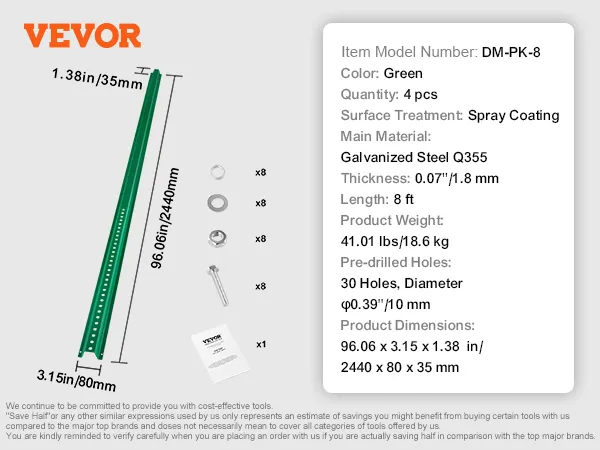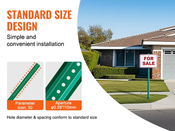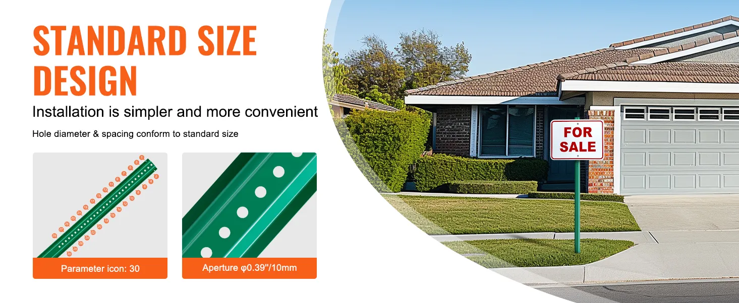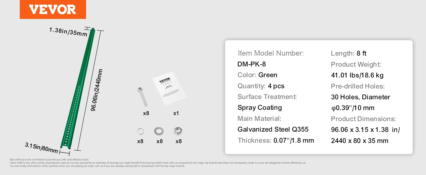 De VEVOR 8ft U-kanaal-bordpaal is gemaakt van hoogwaardig gegalvaniseerd staal. Dit zorgt ervoor dat de paal sterk en duurzaam is. Het staal is gecoat om roest en corrosie te weerstaan. Het biedt een natuurlijke groene afwerking, waardoor het opgaat in de omgeving. Bovendien voegt het esthetiek toe aan uw ruimte, waardoor het een aantrekkelijke uitstraling krijgt, vooral voor gebruik buitenshuis. Wat deze paal speciaal maakt, is dat hij eeuwenlang meegaat. Kan hij zware weersomstandigheden weerstaan? Ja, wij raden hem aan vanwege zijn sterkte en duurzaamheid door de jaren heen.