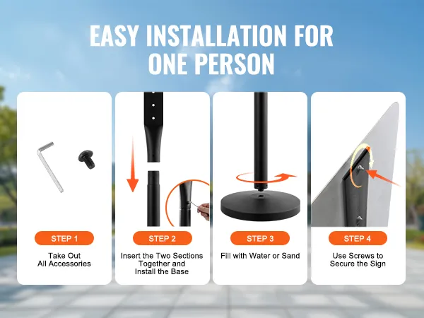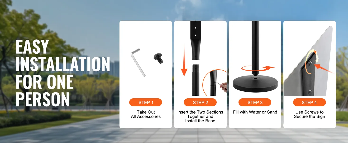 Easy Installation: This portable post sign holders is easy to install with simple operation. No special tools or strenuous digging required. Simply assemble the two sections, install the base, fill with water or sand, and secure the sign with screws. Even beginners can handle installation independently.