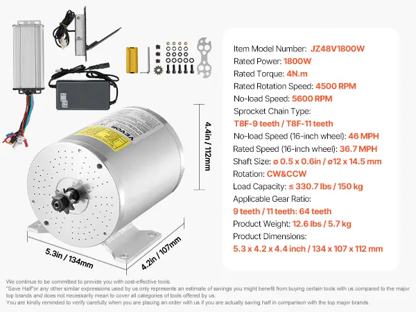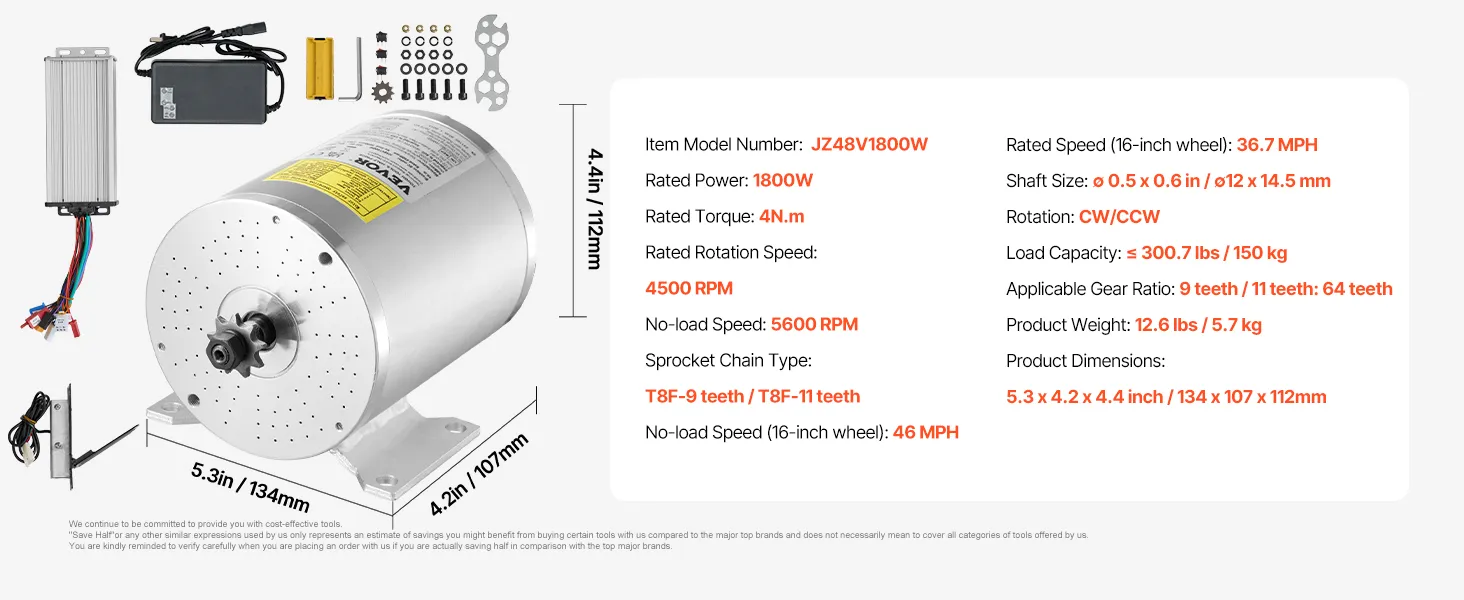 Easy DIY Installation: Package includes: 1 x 48V 1800W Brushless Motor, 1 x Motor Controller, 1 x Foot Pedal Throttle, 1 x Charger, 1 x Set of Assembly Hardware, and 1 x User Manual. This motor kit comes with detailed wiring diagram instruction, ideal for DIY enthusiasts and hobbyists looking to upgrade or build custom electric vehicles.