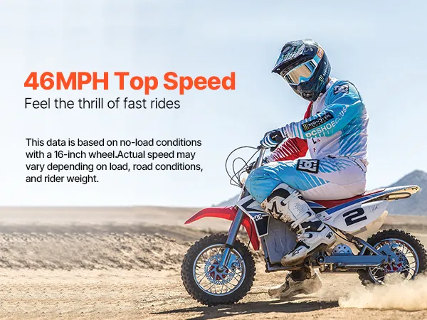 Experience the ultimate thrill with 46 MPH no-load speed! Feel the exhilaration of fast rides that make every journey unforgettable. (This top speed is based on no-load conditions with a 16-inch wheel — actual speed may vary depending on load, road conditions, and rider weight)