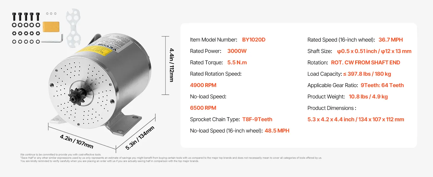 High-Power, Efficient Performance: VEVOR brushless DC motor delivers 3000W of output power and operates efficiently with ≥85% conversion efficiency, ensuring reliable speed even on challenging terrains and less energy consumption. Perfect for electric bikes, scooters, and other DIY electric vehicle projects that require high performance.