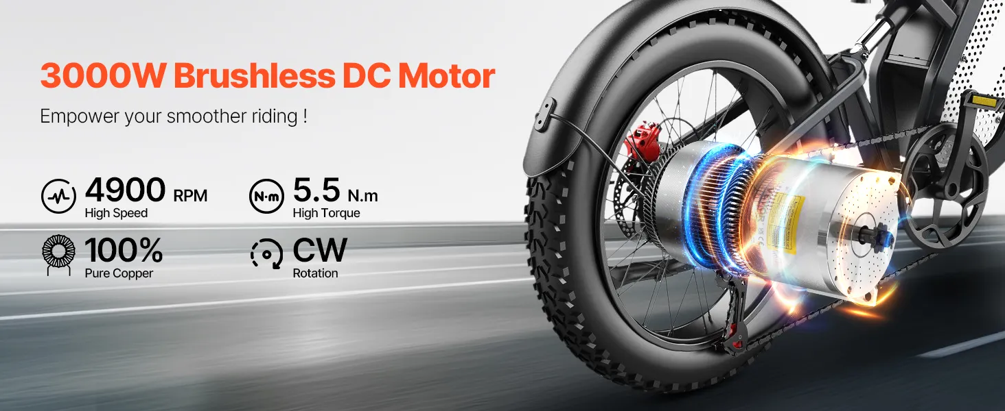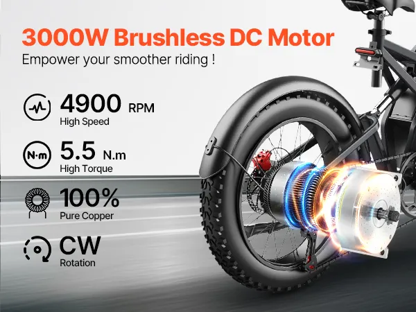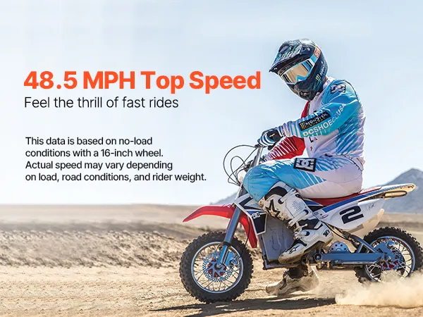 Experience the ultimate thrill with 48.5 MPH no-load speed! Feel the exhilaration of fast rides that make every journey unforgettable. (This top speed is based on no-load conditions with a 16-inch wheel — actual speed may vary depending on load, road conditions, and rider weight)