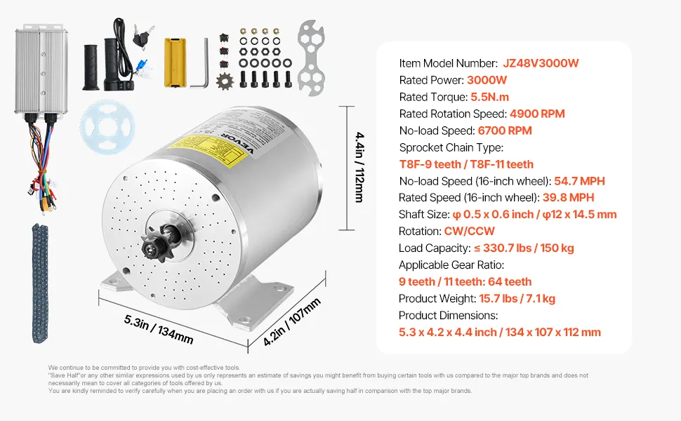 Krachtige, efficiënte prestaties: de borstelloze DC-motor van VEVOR levert een uitgangsvermogen van 3000 W en werkt efficiënt met een conversie-efficiëntie van ≥85%. Dit garandeert een betrouwbare snelheid, zelfs op moeilijk terrein, en een lager energieverbruik. Ideaal voor elektrische fietsen, scooters en andere doe-het-zelfprojecten met elektrische voertuigen die hoge prestaties vereisen.