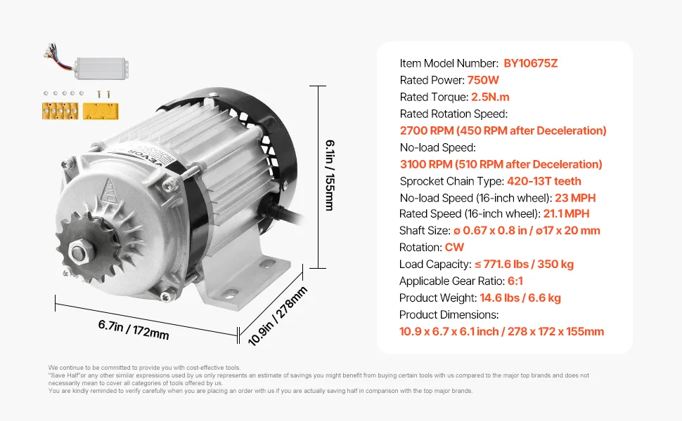 Krachtige, efficiënte prestaties: de borstelloze DC-motor van VEVOR levert een uitgangsvermogen van 750 W en werkt efficiënt met een conversie-efficiëntie van 85%. Dit garandeert een betrouwbare snelheid, zelfs op uitdagend terrein, en een lager energieverbruik. Ideaal voor elektrische fietsen, scooters en andere doe-het-zelfprojecten met elektrische voertuigen waarbij hoge prestaties vereist zijn.