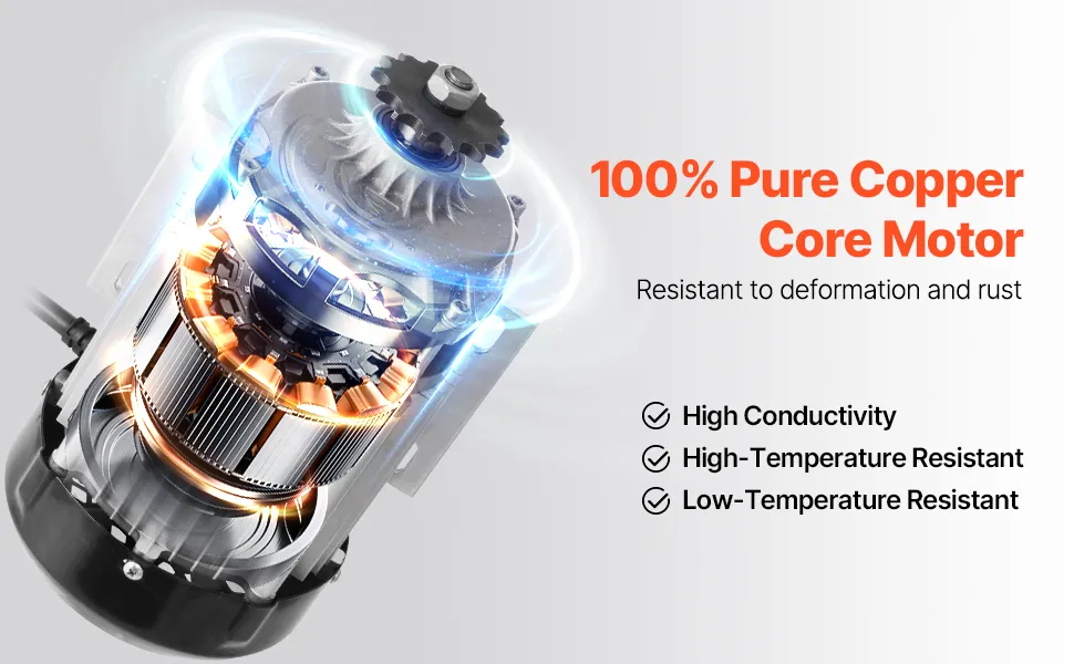 De kern van de motor is gemaakt van 100% zuiver koper en is uitzonderlijk goed bestand tegen vervorming en roest. Bovendien heeft de motor een hoge geleidbaarheid voor een optimaal rendement. Het is ontworpen voor extreme weersomstandigheden en zorgt voor een soepele en veilige rit.