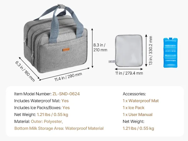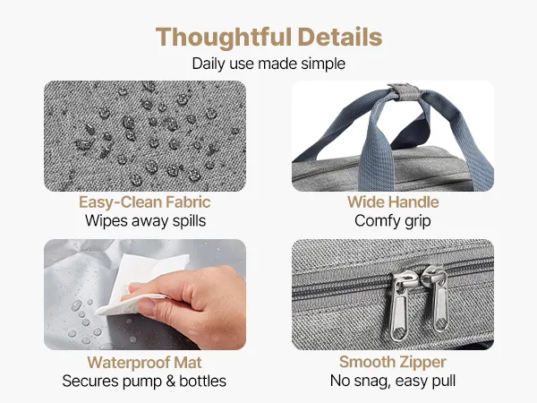 Gemakkelijk mee te nemen: onze melkkoeltas wordt geleverd met een waterdichte mat, zodat je kolven, flessen en accessoires veilig in openbare ruimtes kunt bewaren. Een doordachte keuze voor werkende of borstvoedende moeders die vaak onderweg zijn.