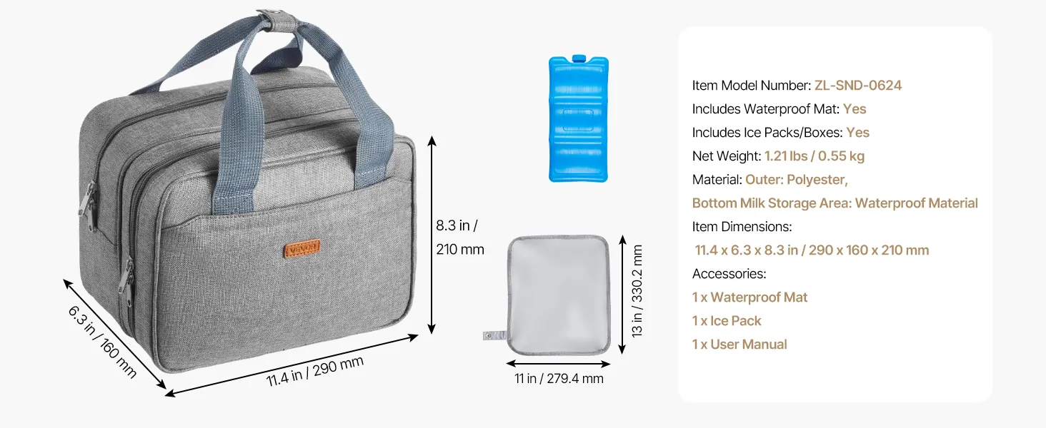 VEVOR Draagbare Borstkolftas 290x160x210 mm, Draagtas voor Borstkolf met Koelpakket, Geschikt voor M5/M6, Borstkolfaccessoires & Moedermelkopslag, voor Werk, Reizen & Gezinsgebruik, Grijs