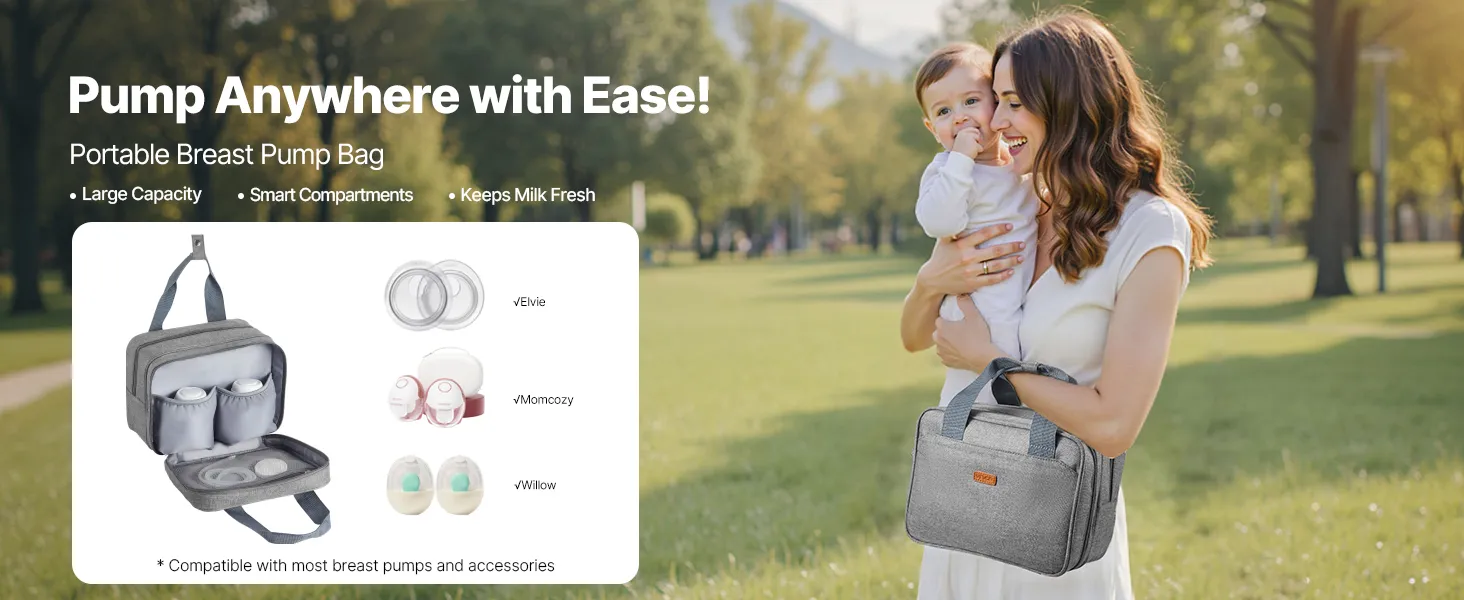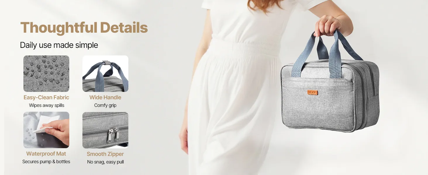Georganiseerde opbergruimte: Het hoofdvak van onze borstkolftas biedt veilige opbergruimte voor kolven en flessen, terwijl gaasvakken ruimte bieden voor doekjes, borstels of tepelcrème. Extra vakken houden mobiele telefoons, sleutels of tissues binnen handbereik. Alles blijft netjes en gemakkelijk toegankelijk.