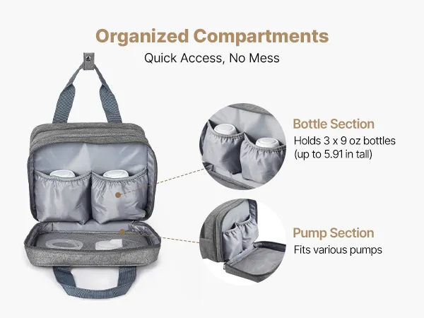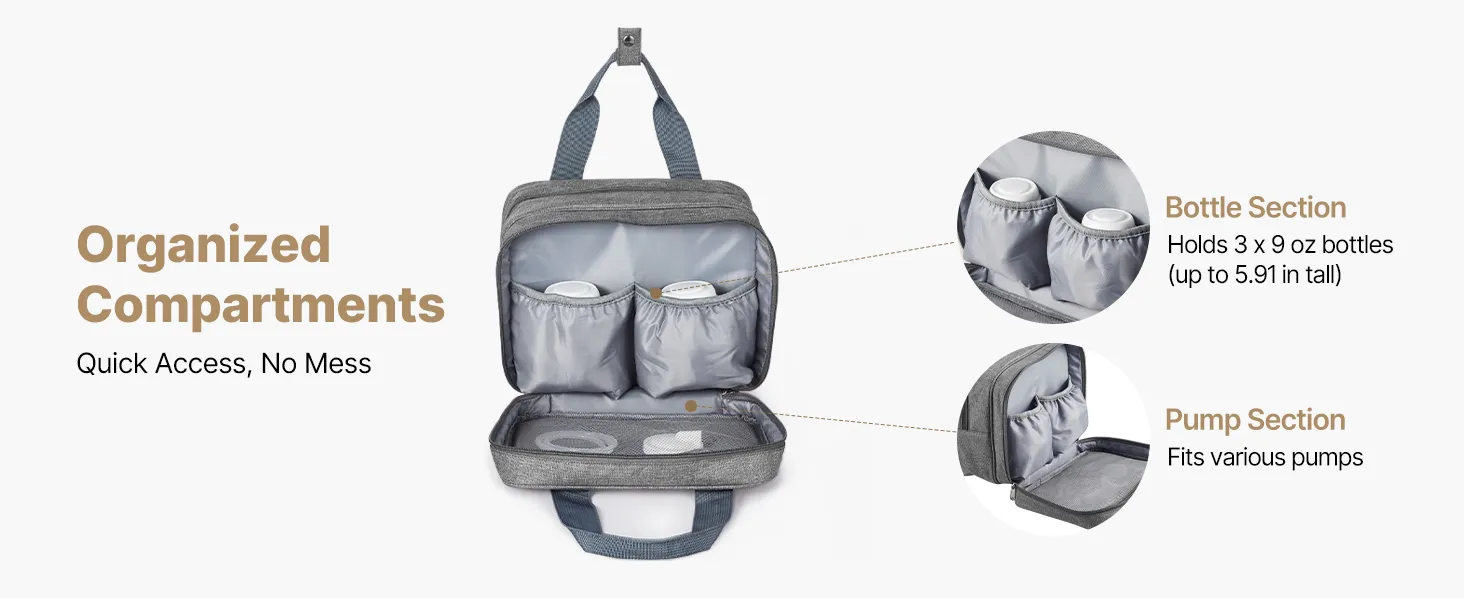 Ruime capaciteit: Deze reistas voor borstkolven heeft een ruim ontwerp en biedt plaats aan grote kolven en meerdere flessen. Elastische vakken en verdelers optimaliseren de ruimtebenutting, waardoor hij ideaal is voor de kinderopvang, op reis of voor dagtripjes.