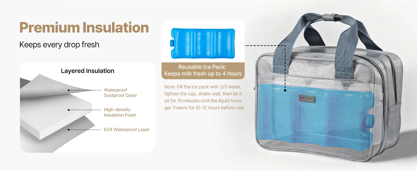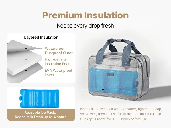 Geïsoleerde frisheid: Twee met folie beklede vakken en een waterdichte onderkant van de voedingstas houden de melk tot wel 4 uur koel met koelelementen. Moeders kunnen vertrouwen op een stabiele isolatie die de frisheid insluit.