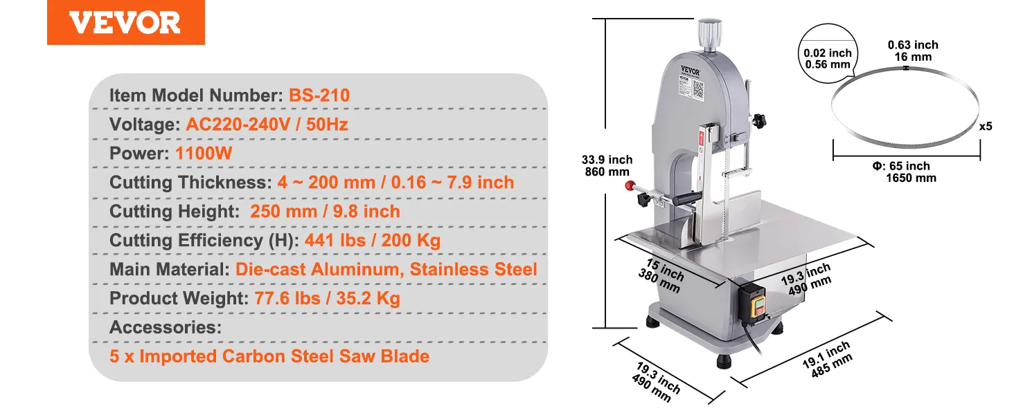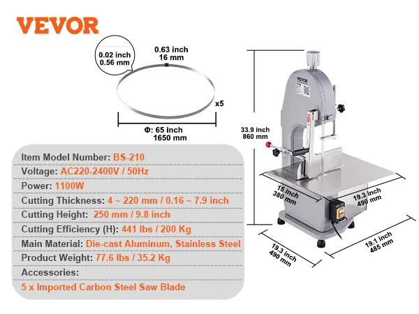 Durable Construction: Crafted with sturdy aluminum alloy and reinforced stainless steel, this bone saw machine is built to last. It comes with five sharp saw blades that can easily cut through various bones and frozen meat. Its wear-resistant and scratch-resistant design ensures long-lasting durability without rusting, providing you with extended usage.