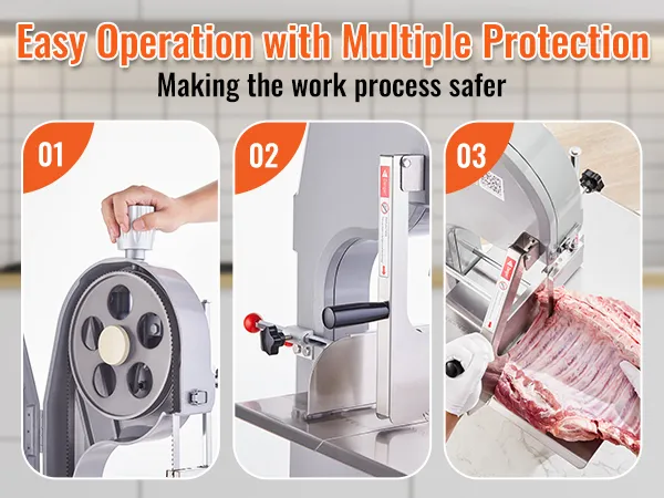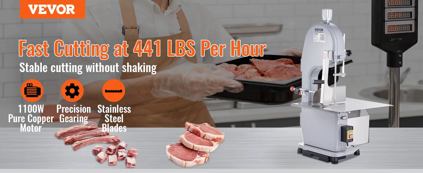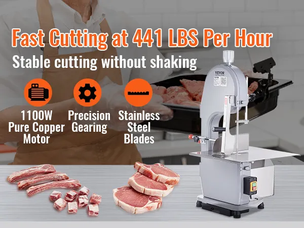 Our bone saw machine is powered by a 1100W pure copper motor to deliver unmatched strength. Combined with sharp stainless steel blades and precision gears, just a gentle push, you can slice through the tough bones and frozen meat.