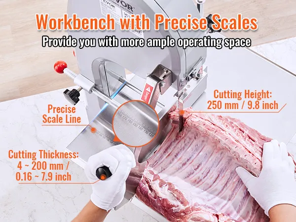 Precise & Even Results: The commercial bone cutting machine can accommodate large pieces of lamb leg bones and beef leg bones. The worktable provides a cutting surface with precise scale lines. You can adjust the desired thickness more accurately as needed. The cutting thickness can be adjusted from 0.16 to 7.9 inches, allowing for excellent results with thin ham slices or thick chunks of bone.