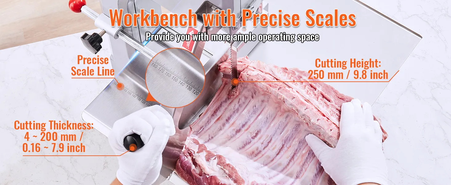 Our stainless steel worktable features precise scale lines, you can adjust the desired thickness (0.16 to 7.9 inches). No matter if you're dealing with large lamb leg bones or beef leg bones, our machine can handle them all. From delicate ham slices to bone chunks, it tackles every cut flawlessly.