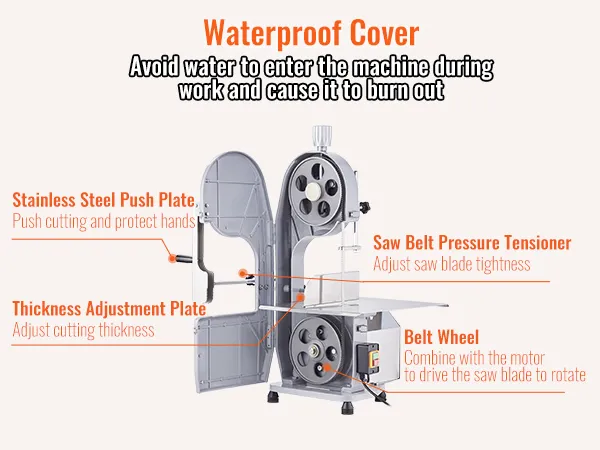 Our meat cutting saw comes with five razor-sharp saw blades. The adjustable blade tensioning device ensures optimal performance without risking breakage. Plus, the waste collection box makes cleanup a breeze. Effortlessly maintain cleanliness and organization.