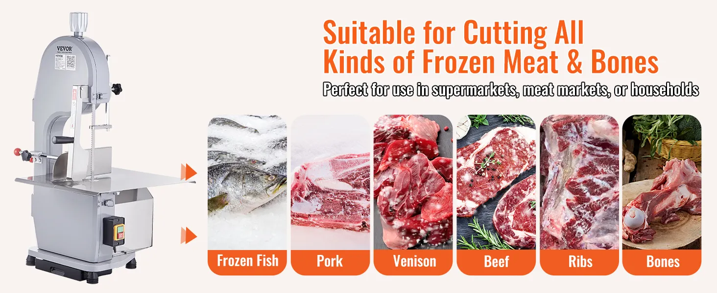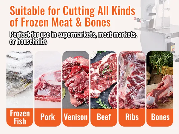 Multiple Use Scenarios: Our commercial electric meat bandsaw is ideal for cutting ribs, venison, beef bones, lamb bones, frozen fish, and more. Suitable for restaurants, meat franchise stores, supermarkets, meat processing plants, seafood processing plants, slaughterhouses, etc.