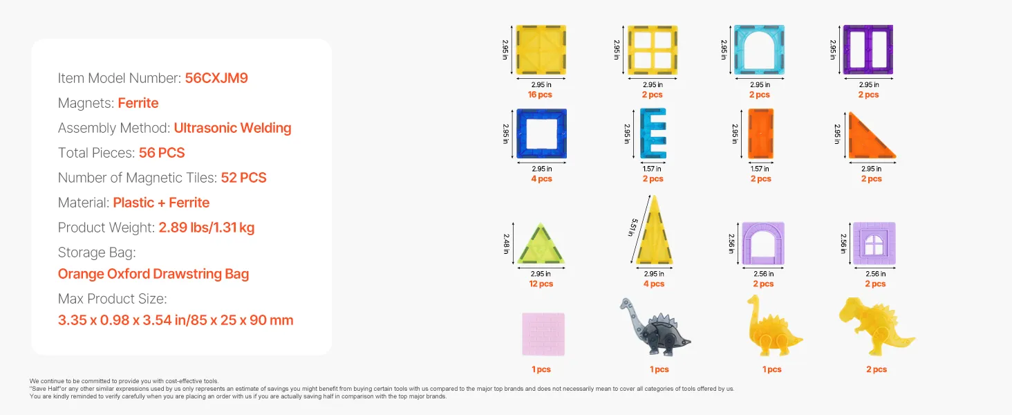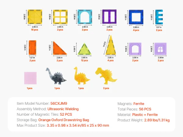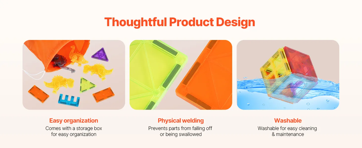 Veiligheid en duurzaamheid: onze magnetische tegels zijn gemaakt van onschadelijk, voedselveilig ABS-plastic en zijn veilig voor kinderen. De gladde oppervlakken en afgeronde randen zorgen voor de veiligheid van kleine handjes, terwijl de magneten veilig binnenin worden gehouden door ultrasoon lassen. De interne structuur verbetert de stabiliteit van de platen en vermindert het risico op breuk, waardoor een lange levensduur wordt gegarandeerd.
