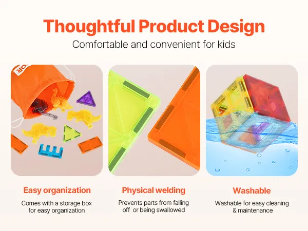 Deze set magnetische bouwstenen voor kinderen wordt geleverd in een hoogwaardig Oxford-zakje met trekkoord. Het ontwerp uit één stuk voorkomt dat onderdelen eruit vallen en is wasbaar, waardoor het onderhoud voor drukke ouders gemakkelijker wordt.