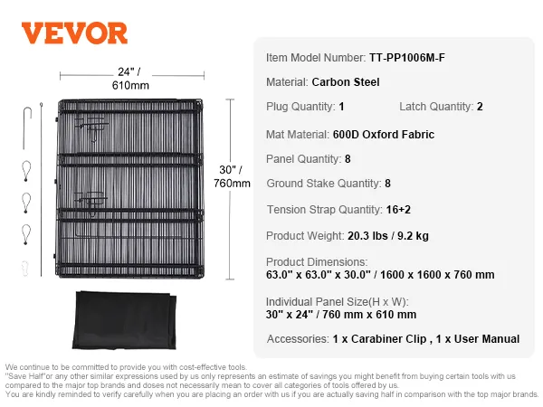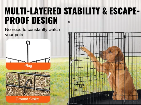 Escape Prevention: 8 long ground stakes and 1 reinforced stake securely anchor the pet playpen in place. Dual door latches and 1 carabiner clip keep pets from opening the door and escaping. Reinforced, tightly-knit metal mesh resists play and chewing, while the Oxford fabric is secured tightly with elastic buckles for a seamless fit along the bottom.