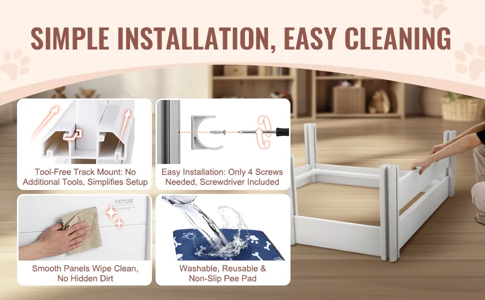 Eenvoudig te installeren en schoon te maken: deze hondenwerpbox is eenvoudig te installeren en minimaliseert uw werklast. Volg de duidelijke instructies en zet de wanden in elkaar en zet ze vast met de vier meegeleverde schroeven en de meegeleverde schroevendraaier. De installatie duurt slechts enkele minuten. De gladde wanden zijn eenvoudig schoon te vegen en hebben geen verborgen hoekjes voor vuil. Hierdoor is de gezondheid van uw hond vanaf het begin gegarandeerd.