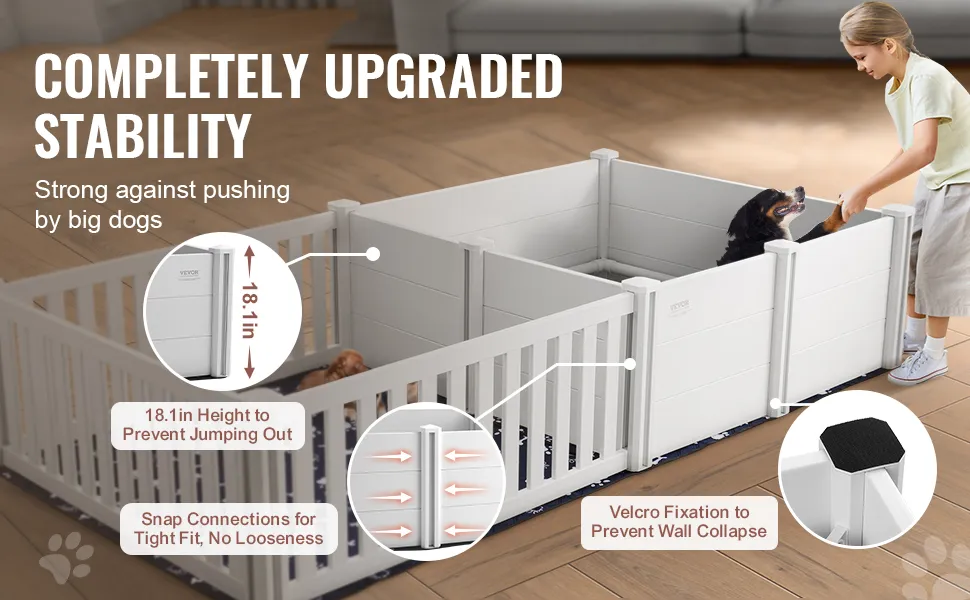 Opmerkelijke stabiliteit: deze werpkist met rails is verhoogd tot een hoogte van 460 mm en voorkomt dat de moederhond eruit springt zodra alle panelen zijn geïnstalleerd. Klittenbandsluitingen bevestigen de plaspads aan de hoeken, waardoor de wanden op hun plaats blijven zonder te kantelen of te verschuiven. De klikverbindingen zijn convex gesneden, waardoor scheuren bij demontage worden voorkomen en de panelen stevig op hun plaats blijven.