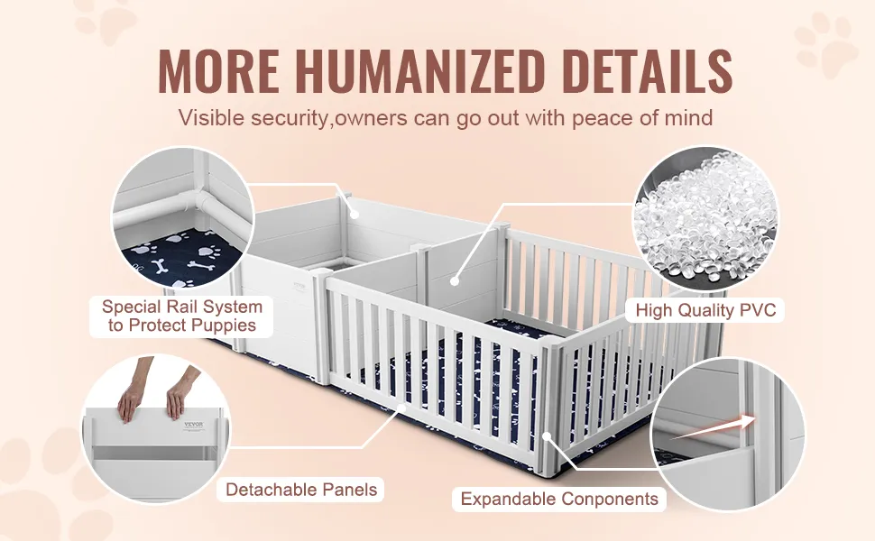 Uitgebreid veiligheidsontwerp: deze puppywerpkist is meer dan een tijdelijke geboorteruimte; het dient als langdurig speel- en slaapgedeelte. Door een deel van de verwijderbare panelen te verwijderen kan de moederhond vrij in- en uitstappen, terwijl de pups veilig binnen blijven. Het speciale railsysteem voorkomt onbedoeld beknellen, waardoor het risico op verstikking wordt verminderd. Uitbreidbare secties zorgen voor flexibele groei wanneer puppy's meer ruimte nodig hebben.