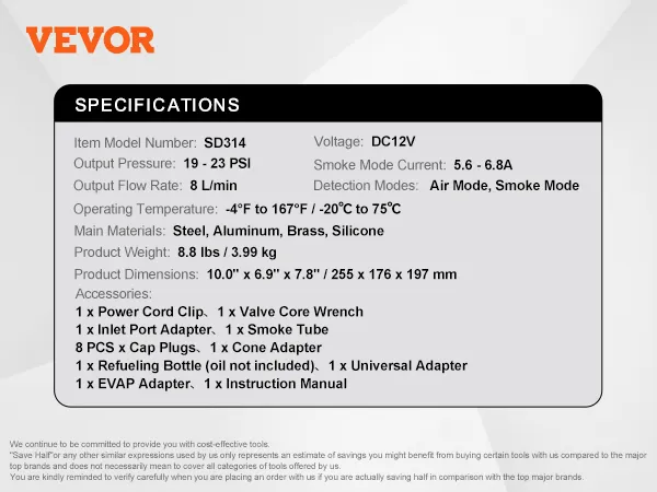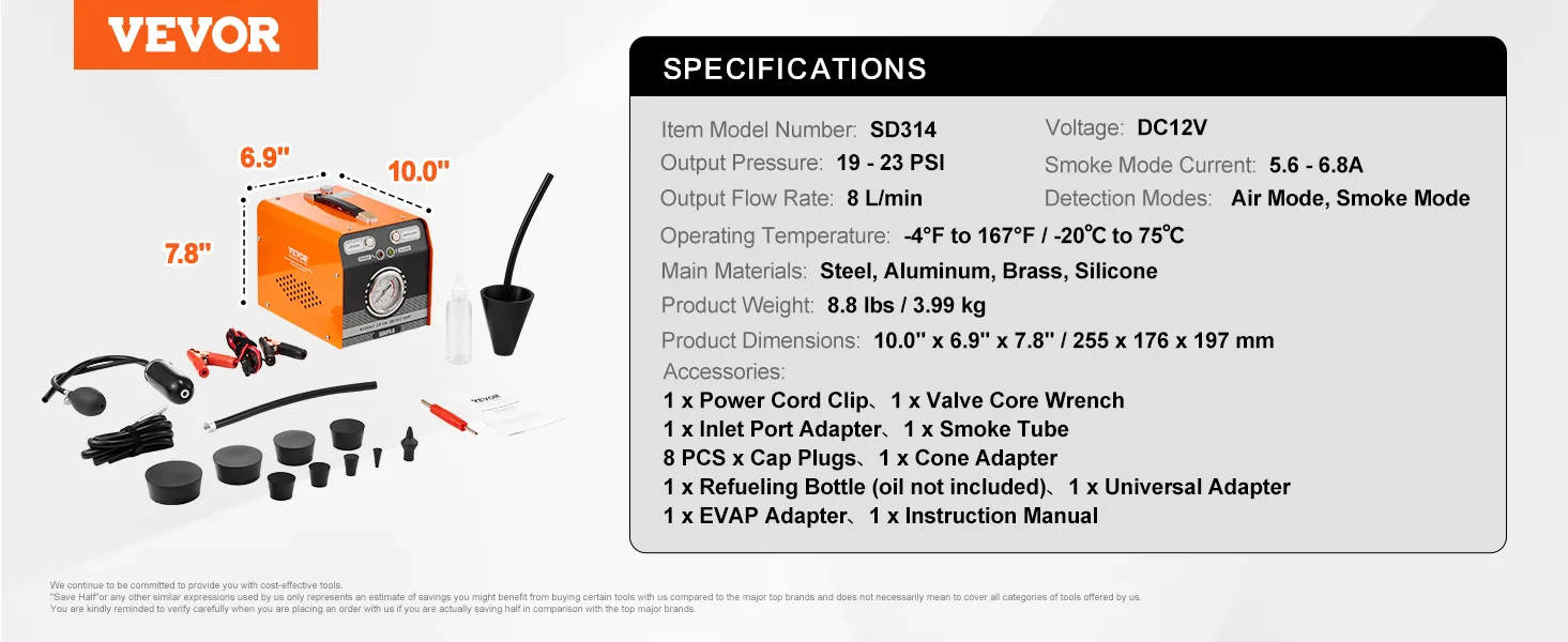 Veelzijdige testtoepassingen: de VEVOR-automistmachine is uw ultieme testinstrument - of u nu werkt met EVAP-systemen, brandstoftanks, uitlaatsystemen, inlaatsystemen, voertuigafdichtingen of verschillende leidingverbindingen, deze lekdetector heeft u gedekt. Het is geschikt voor auto's, motorfietsen, terreinvoertuigen en lichte vrachtwagens en biedt een uitgebreide oplossing voor een grondige diagnose van voertuiglekken.