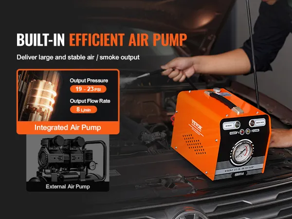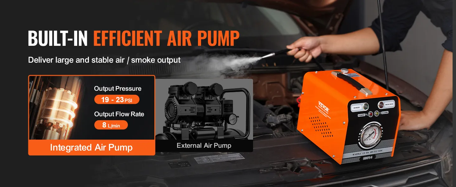 Het apparaat heeft een ingebouwde luchtpomp die zorgt voor een efficiënte en probleemloze werking. De ingebouwde pomp vereenvoudigt het diagnoseproces en zorgt ervoor dat de rooktester overal mee naartoe kan worden genomen en gebruikt zonder dat u een extra luchtpomp hoeft aan te schaffen.