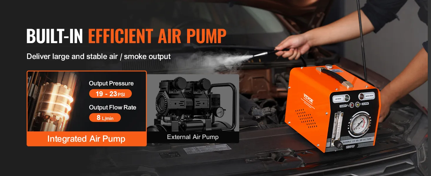 Built-in Air Pump: Eliminate the hassle of external pumps. Our all-in-one smoke machine leak detector features a built-in air pump, with 8L/min smoke output and 19-23 PSI pressure, provideing quick, robust, and stable smoke delivery. Enjoy effortless leak diagnostics anytime and anywhere, no need to purchase additional air pump !