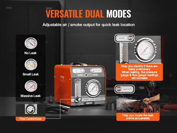 2 Detection Modes: Switch effortlessly between two detection modes with 2 independent buttons. The air mode is ideal for identifying if there are leaks, while the smoke mode help you locate the leak point accuarately. This dual functionality ensures a comprehensive approach to both initial and detailed diagnostic.