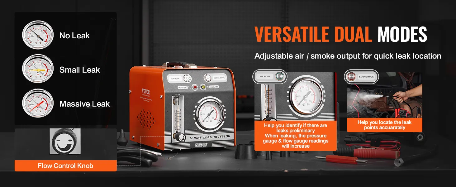 Stay informed with dual high-precision gauges—our smoke machine includes a pressure gauge and flow meter that monitor smoke flow and pressure changes in real-time. The flow control knob allows you to adjust smoke output for optimal results across various testing conditions.