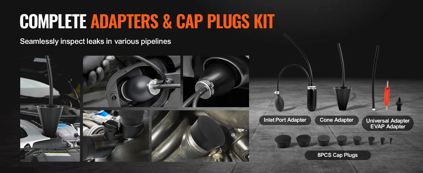 Complete Accessory Kit: Fully equipped for efficient diagnostics - our DC12V automotive smoke machine includes a universal adapter, cone adapter, EVAP adapter, inlet port adapter, 8 cap plugs, power cord clip, valve core wrench, smoke tube, and refueling bottle. Before use, remember to add 10-20 ml of baby oil or mineral oil (not included)