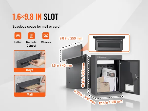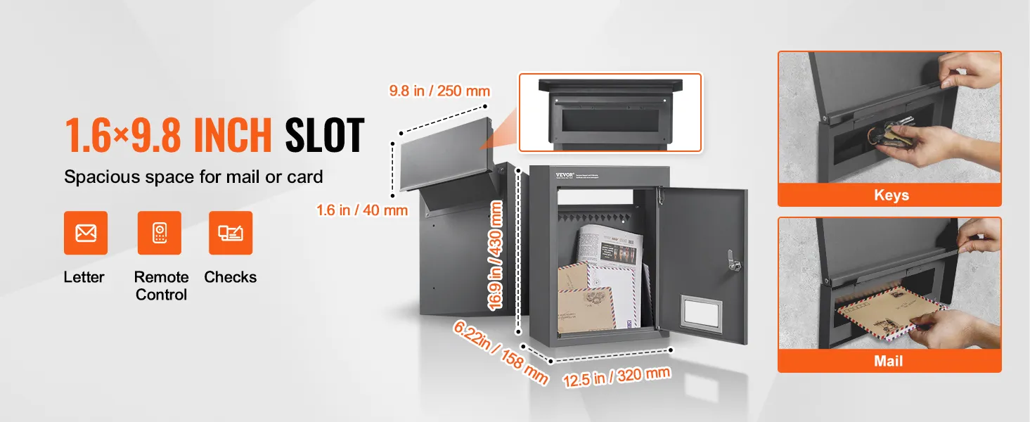 Large Storage Box and Location: The wall-mounted drop box includes a 320 x 158 x 430mm / 12.6 x 6.22 x 16.9 inch storage box that can accommodate various items. The 1.6 x 9.8 inch (40 x 250 mm) slot is suitable for smartphones, envelopes and small packages.