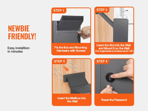 Easily attach the box and installation parts with screws. Insert the rails into the wall at a 135° angle to ensure a perfect fit. Then insert the mailbox into the wall and install it.