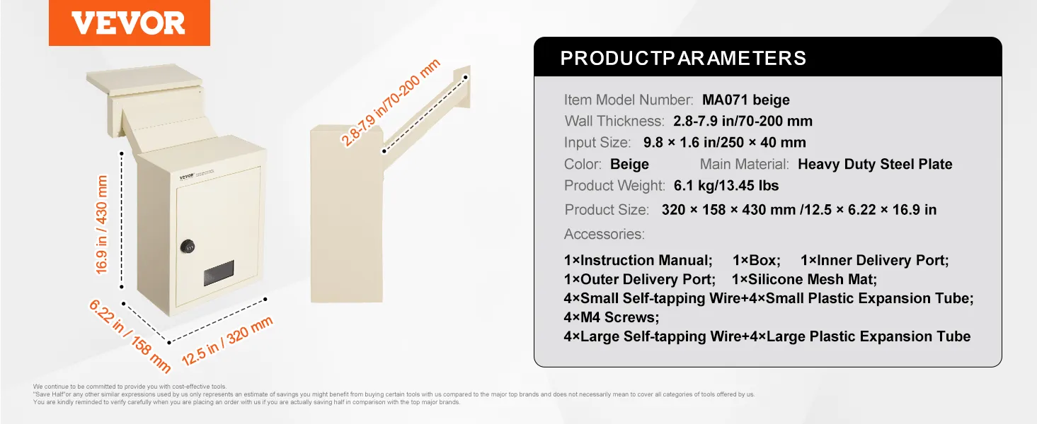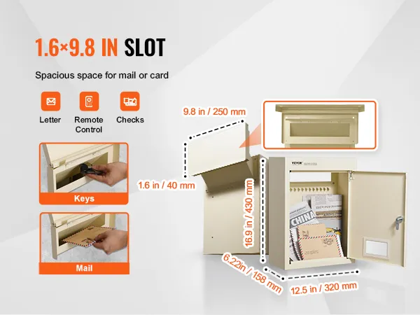 Large Storage Box & Slot: The through the wall drop box includes a 12.5×6.3×16.9 inch storage box, providing a space of 0.74 cubic feet, capable of accommodating various items. The 1.6×9.8 inch (40×250mm) slot is suitable for smartphones, envelopes, and small packages.