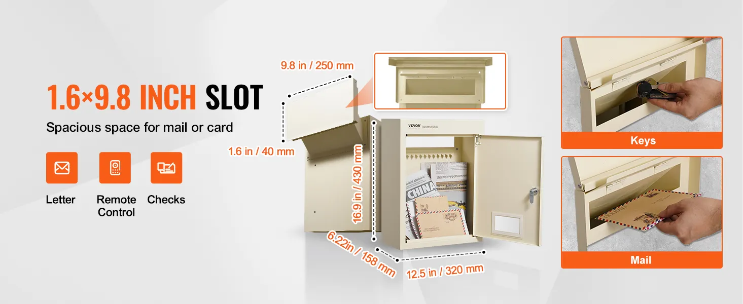 Mail comes in various sizes, but our wide 9.5x1 inch slot of through the wall drop box accommodates everything from large parcels to small cards with ease. Whether it's envelopes, keys, remote controllers, or rental checks, everything fits effortlessly.