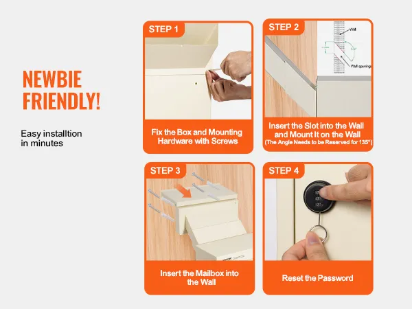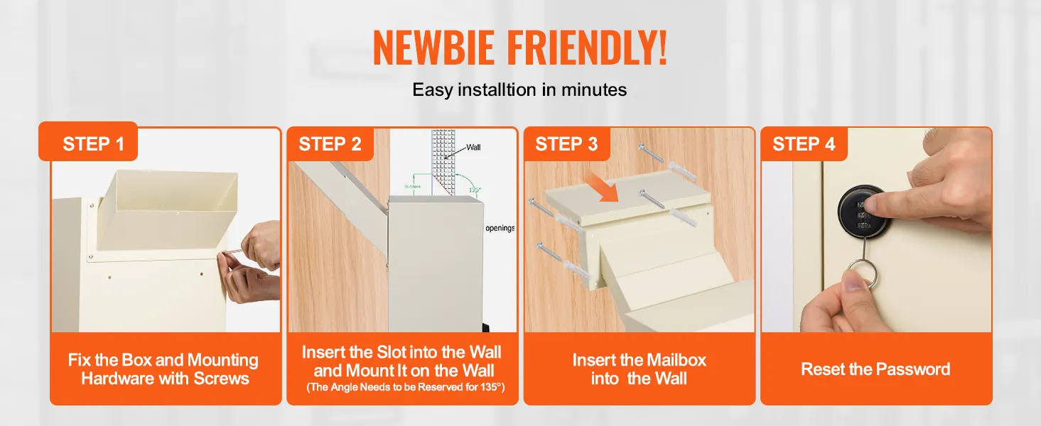 Our mailbox design considers every detail, making installation a breeze. Secure the box and installation hardware with screws effortlessly; insert the slides into the wall at a 135° angle, ensuring a perfect fit; then insert the mailbox into the wall and install it.