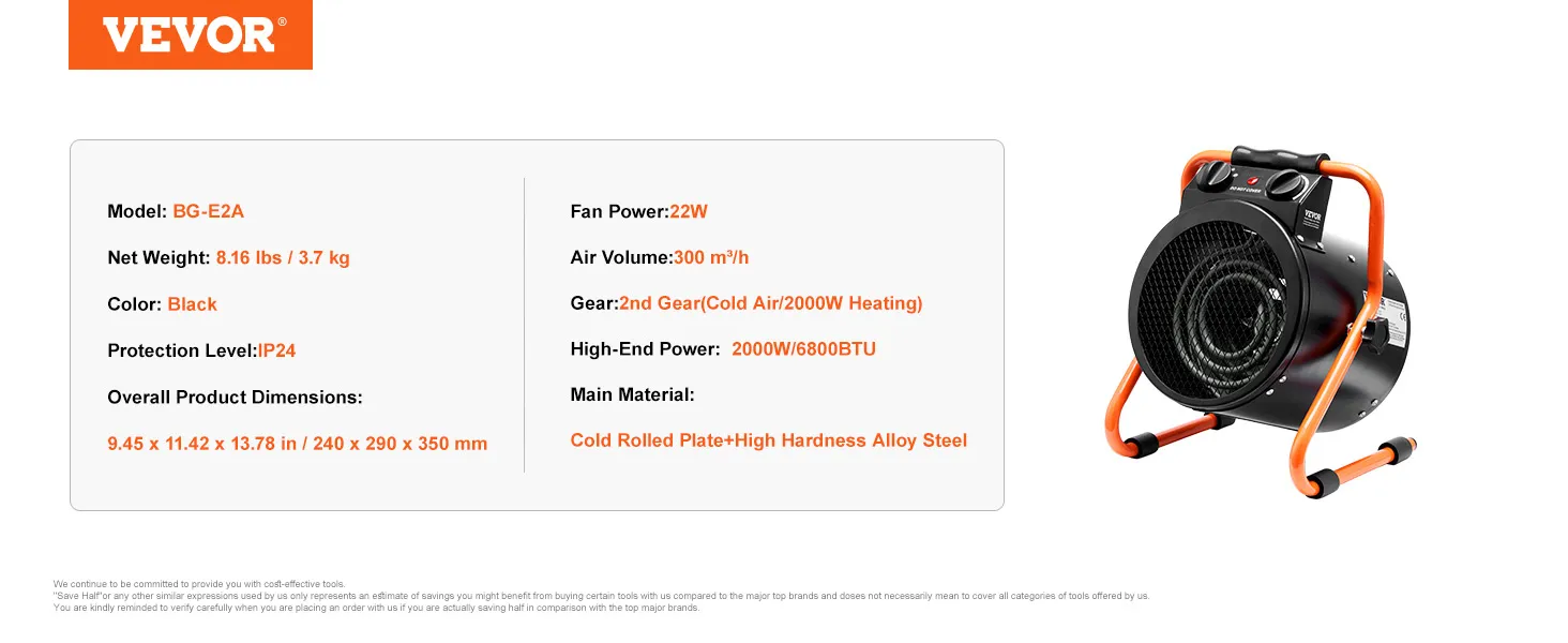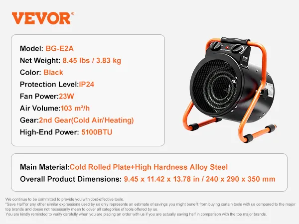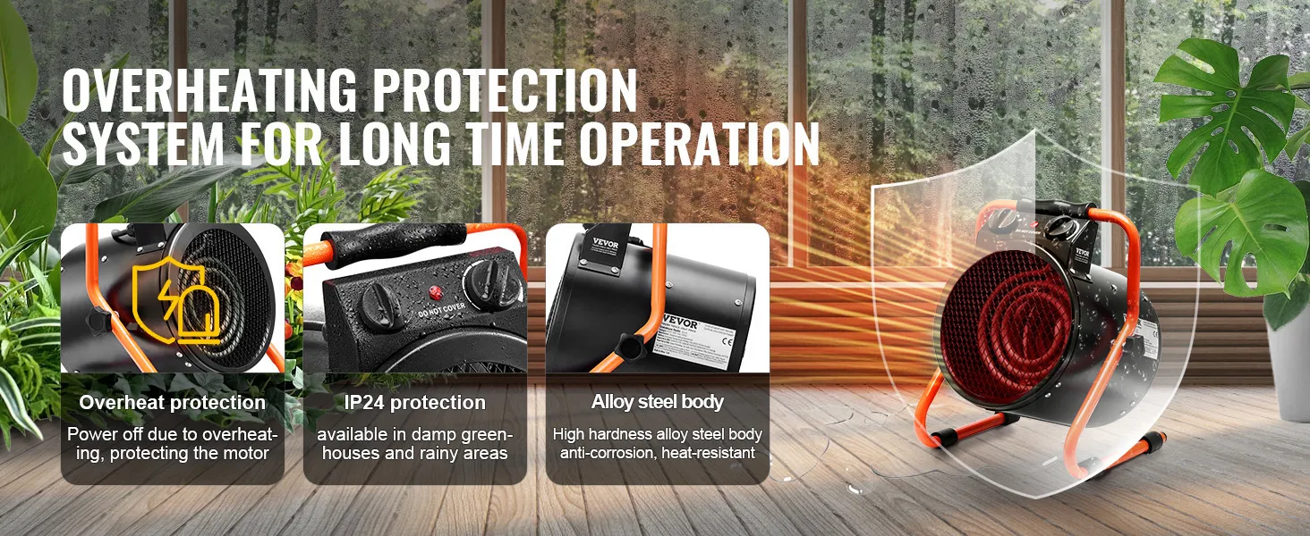 IP24 Spatwaterdicht: het is gemaakt van gelegeerd staal met een hoge hardheid en heeft een IP24 spatwaterdicht ontwerp, zodat het zelfs in vochtige omstandigheden niet bang is. Met bescherming tegen oververhitting zorgt het voor veiligheid en gemoedsrust. Deze heater biedt een lange levensduur en is geschikt voor diverse vochtige omstandigheden.