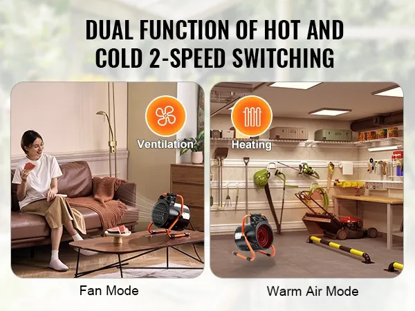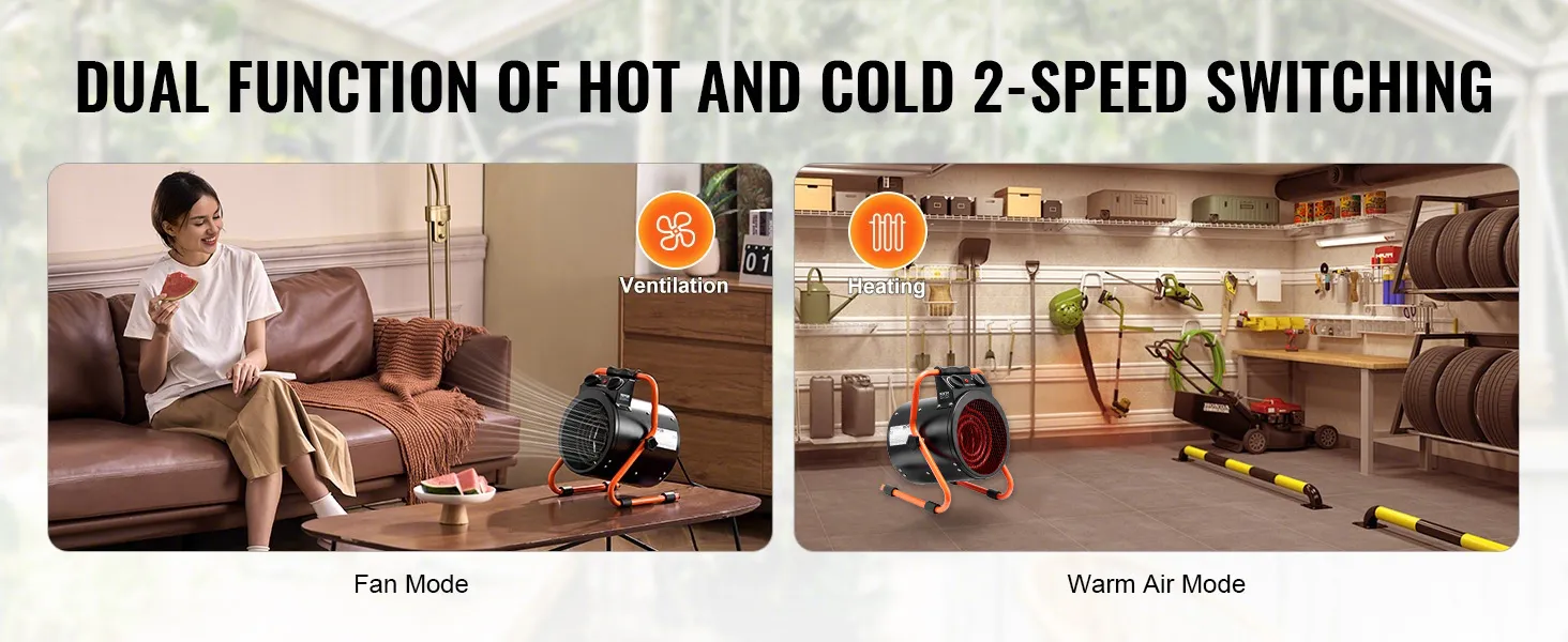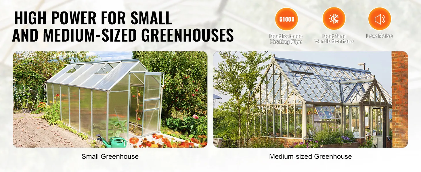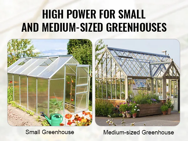 Warme en koude modus: de verwarming kan het hele jaar door worden gebruikt. Het houdt je warm in de winter en koel in de zomer en zorgt voor geschikte omstandigheden voor planten. De verwarmingsstand is eenvoudig in gebruik en warmt snel en gelijkmatig op, terwijl de ventilatiestand koelt met een ventilator. De tweetraps temperatuurregelaar voldoet aan uw verschillende gebruiksbehoeften.