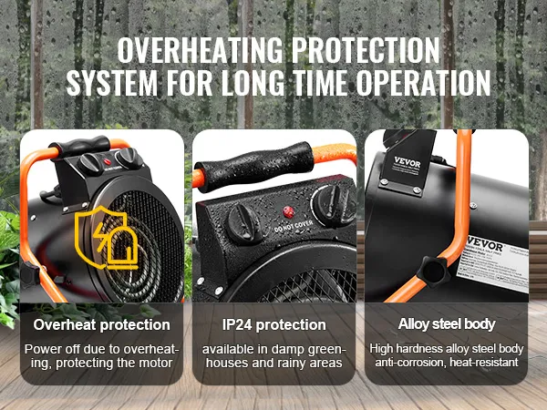 Uitgerust met een oververhittingsbeveiligingssysteem, zorgt het voor een veilige werking op de lange termijn. De IP24-classificatie maakt hem geschikt voor gebruik in kassen aan de kust en regenachtige gebieden. De behuizing van gelegeerd staal zorgt voor een comfortabele verwarmingservaring.