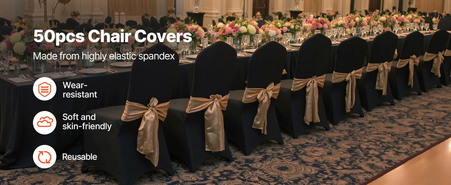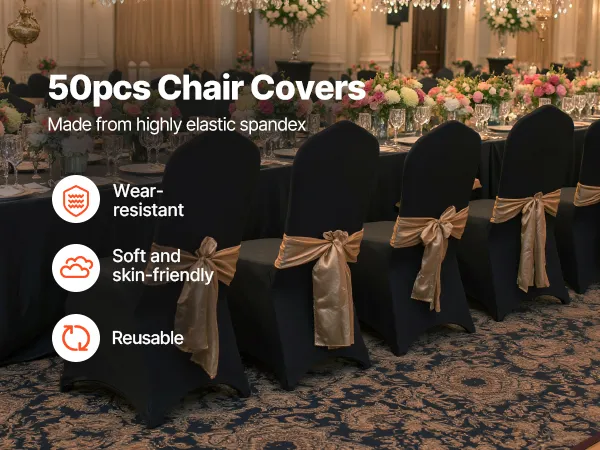 De elegante zwarte kleur van deze stoelhoezen voegt een tijdloze touch van verfijning toe aan elk evenementdecor. Zwart is een veelzijdige kleur die past bij een breed scala aan thema's en kleurenschema's, waardoor het een uitstekende keuze is voor zowel formele als informele evenementen. Of u nu een bruiloft, gala of zakelijk diner organiseert, de strakke zwarte hoezen verhogen de algehele ambiance en geven uw evenement een verfijnde en gepolijste uitstraling. Bovendien helpt de donkere kleur om vuil en gemorste vloeistoffen te verbergen, waardoor uw stoelen er gedurende het hele evenement onberispelijk uitzien.