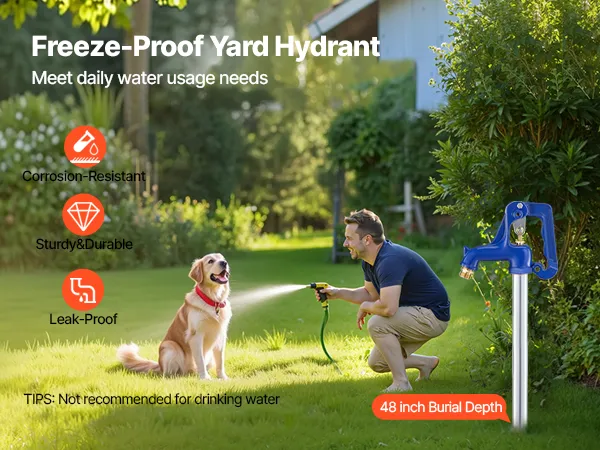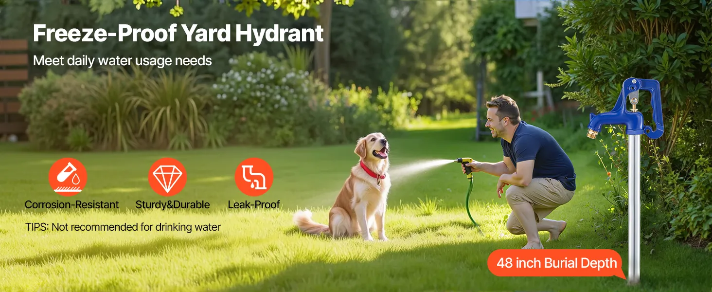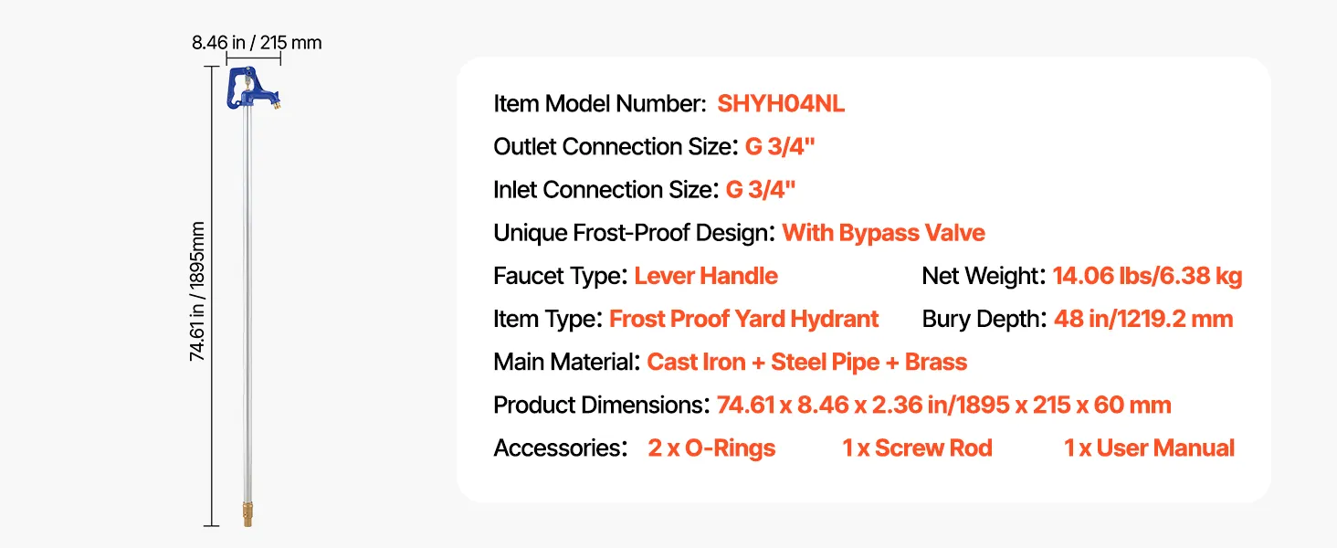 De VEVOR vorstbestendige tuinkraan heeft een totale lengte van 1895 mm, een insteekdiepte van 1219,2 mm en een bypassklep, die een constante waterstroom garandeert, zelfs bij vrieskou. De robuuste constructie vermindert lekkages en garandeert een lange levensduur – ideaal voor tuinirrigatie, autowassen en het besproeien van akkers.