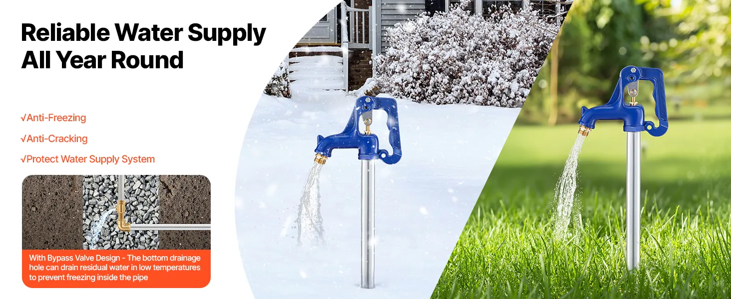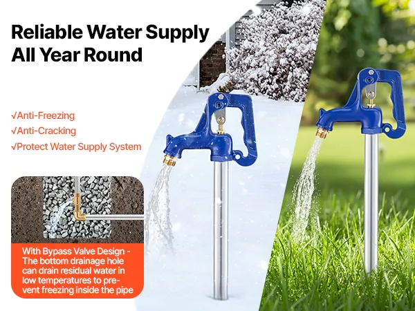 Verbeterd vorstbestendig ontwerp: Onze vorstbestendige tuinkraan is voorzien van een bypassklep die bij koud weer restwater via de onderste opening afvoert. Dit voorkomt dat water zich in de leiding ophoopt en bevriest, waardoor een ononderbroken watertoevoer het hele jaar door gegarandeerd is.