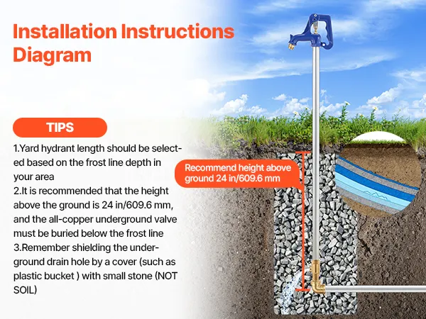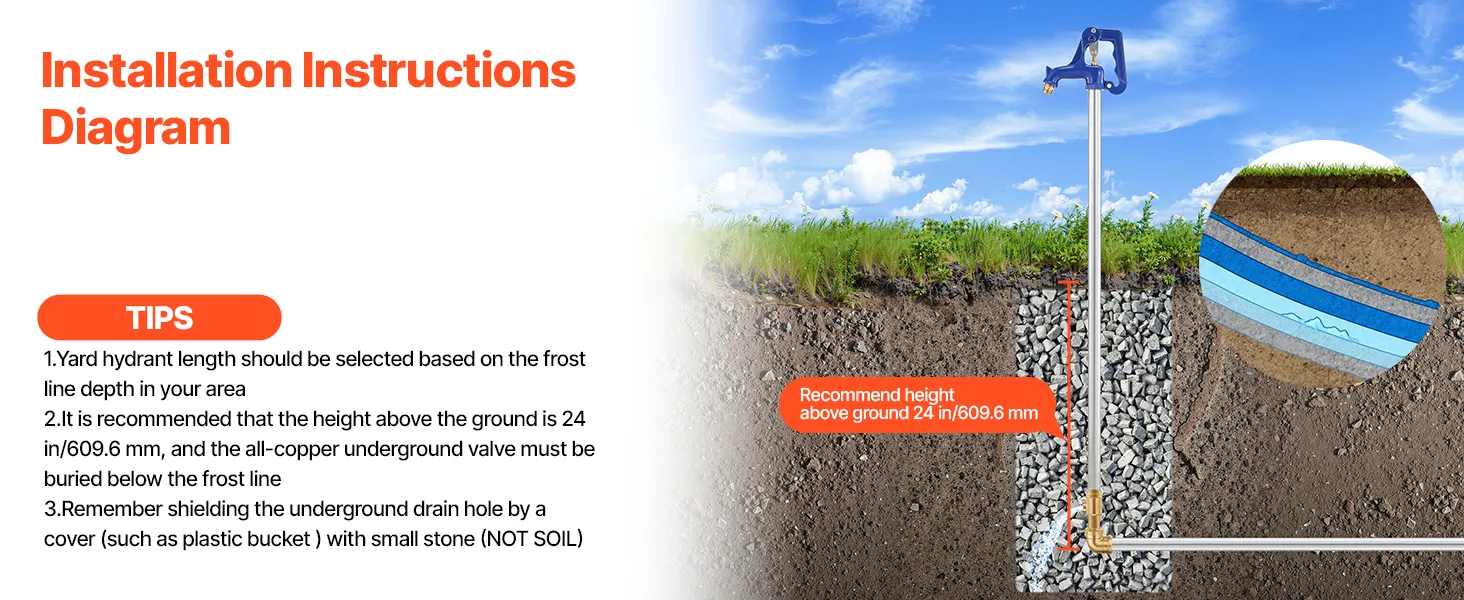 Zorg voor een constante watertoevoer: Deze vorstbestendige tuinkraan heeft een totale lengte van 1895 mm en een inbouwdiepte van 1219,2 mm, waardoor leidingen effectief beschermd worden tegen bevriezing. Ideaal voor tuinirrigatie, autowassen, landbouwbewatering en gazononderhoud (niet geschikt als drinkwater).