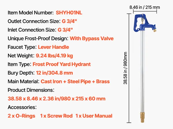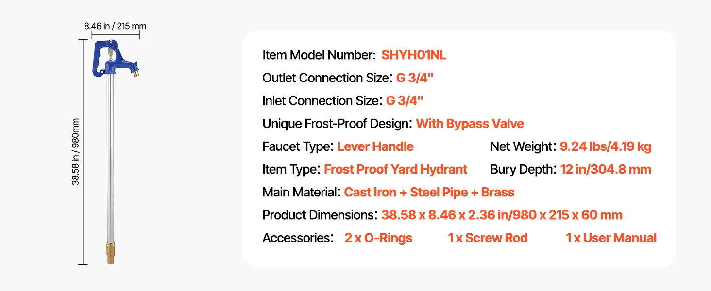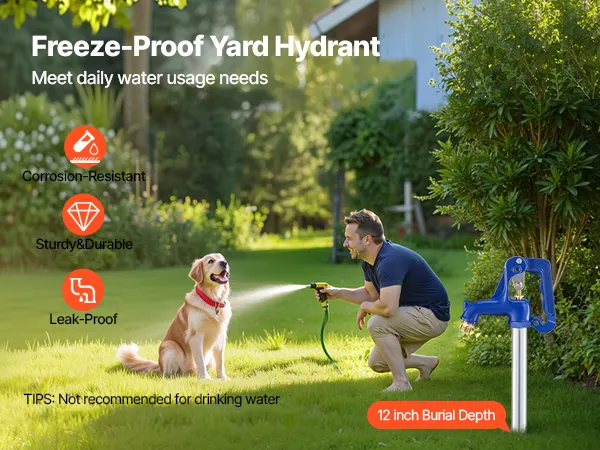 De VEVOR vorstbestendige tuinkraan heeft een totale lengte van 980 mm, een insteekdiepte van 30 cm en een bypassklep, die zorgt voor een constante waterstroom, zelfs bij vrieskou. De robuuste constructie vermindert lekkages en garandeert een lange levensduur – ideaal voor tuinirrigatie, autowassen en het besproeien van akkers.