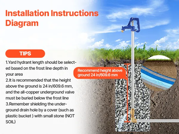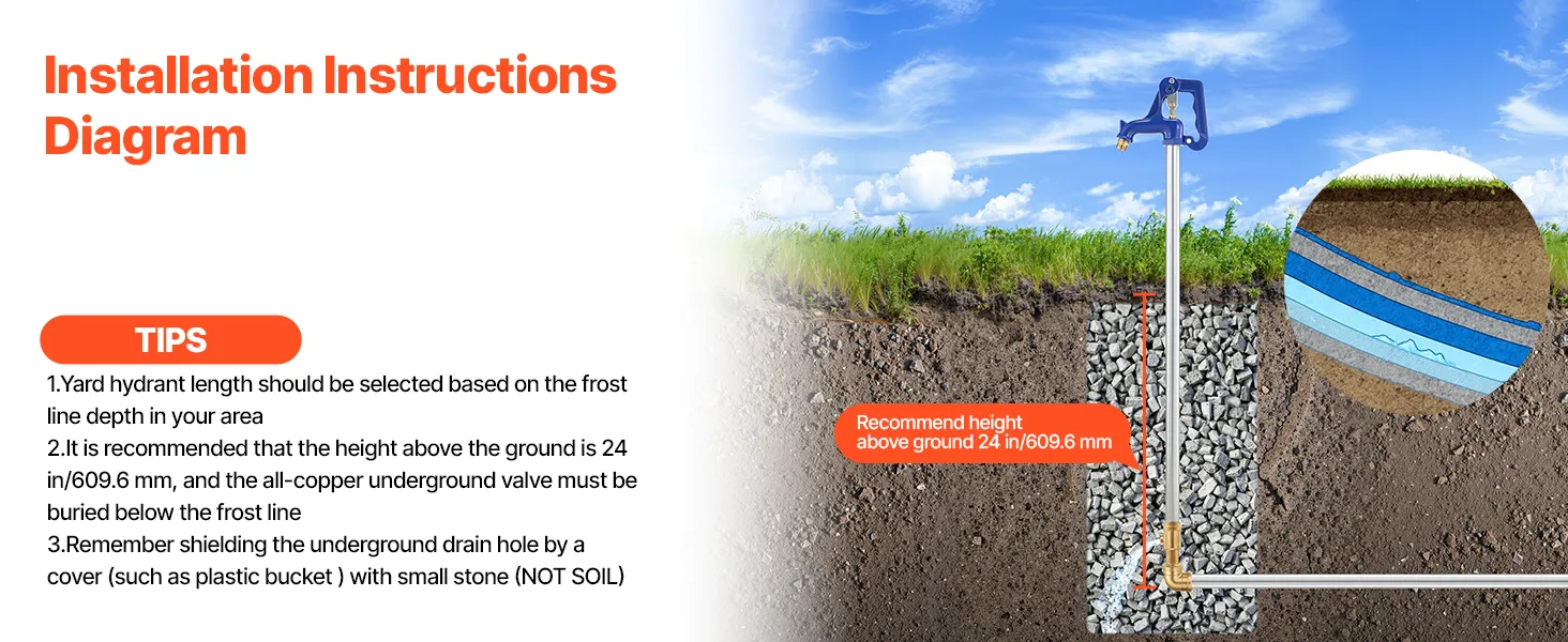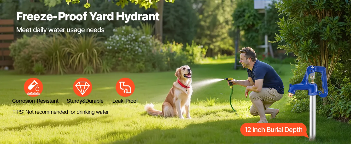 Zorg voor een continue watertoevoer: De vorstbestendige VEVOR tuinkraan heeft een totale lengte van 980 mm en een inbouwdiepte van 304,8 mm, waardoor leidingen effectief beschermd worden tegen bevriezing. Ideaal voor tuinirrigatie, autowassen, landbouwbewatering en gazononderhoud (niet aanbevolen voor drinkwater).